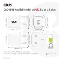 The Club3D CAC-1909 Travel Charger PPS 45W GAN technology, Dual port USB Type-C, Power Delivery(PD) 3.0 Support. Compact size & Superior Performance: GAN technology chipset makes this charger 50% smaller than traditional 45W charger, small enough to carry anywhere. The Programmable Power Supply(PPS) 45W wall charger match a variety of PD devices from smart phones to laptops, one for all making charging simple. This wide compatibility charger will be your convenient companion during your business trip or vacation. The Power Charger is light weight without compromising on Quality and safety. By adopting Power Delivery(PD) charging technology, this versatile Power Charger provides you with charging function through Dual USB Type-C interface, you can charge any connected Mobilephone / Tablet / NoteBook. Furthermore all it needs is a free USB Type-C port on your Dock/NoteBook/Tablet/ Mobile phone to be charged via the bundled USB cable.