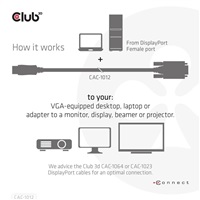 The Club 3D CAC-1012 DisplayPort™ to VGA Cable M/M 2m/6.56ft 28AWG links any DisplayPort™-equipped desktop, laptop or adapter to a monitor, display, beamer or projector with a 15-pin VGA Female port. Ideal for at home or work, the cable creates a reliable connection for anything from gaming to video projection and supports up to Full HD 1080p(max. resolution of 1920 x 1080). A Micro USB port is also provide for External Power. This quality DisplayPort™ to VGA cable provides superior performance thanks to the combined effect of its Gold plated connectors and 28 AWG conductors. Internal shielding provides reduced crosstalk, suppresses noise, and helps prevent electromagnetic interference (EMI) and radio frequency interference (RFI).Experience a reliable, high-quality connection with this convenient DisplayPort™ to VGA 2m/6.56ft cable.