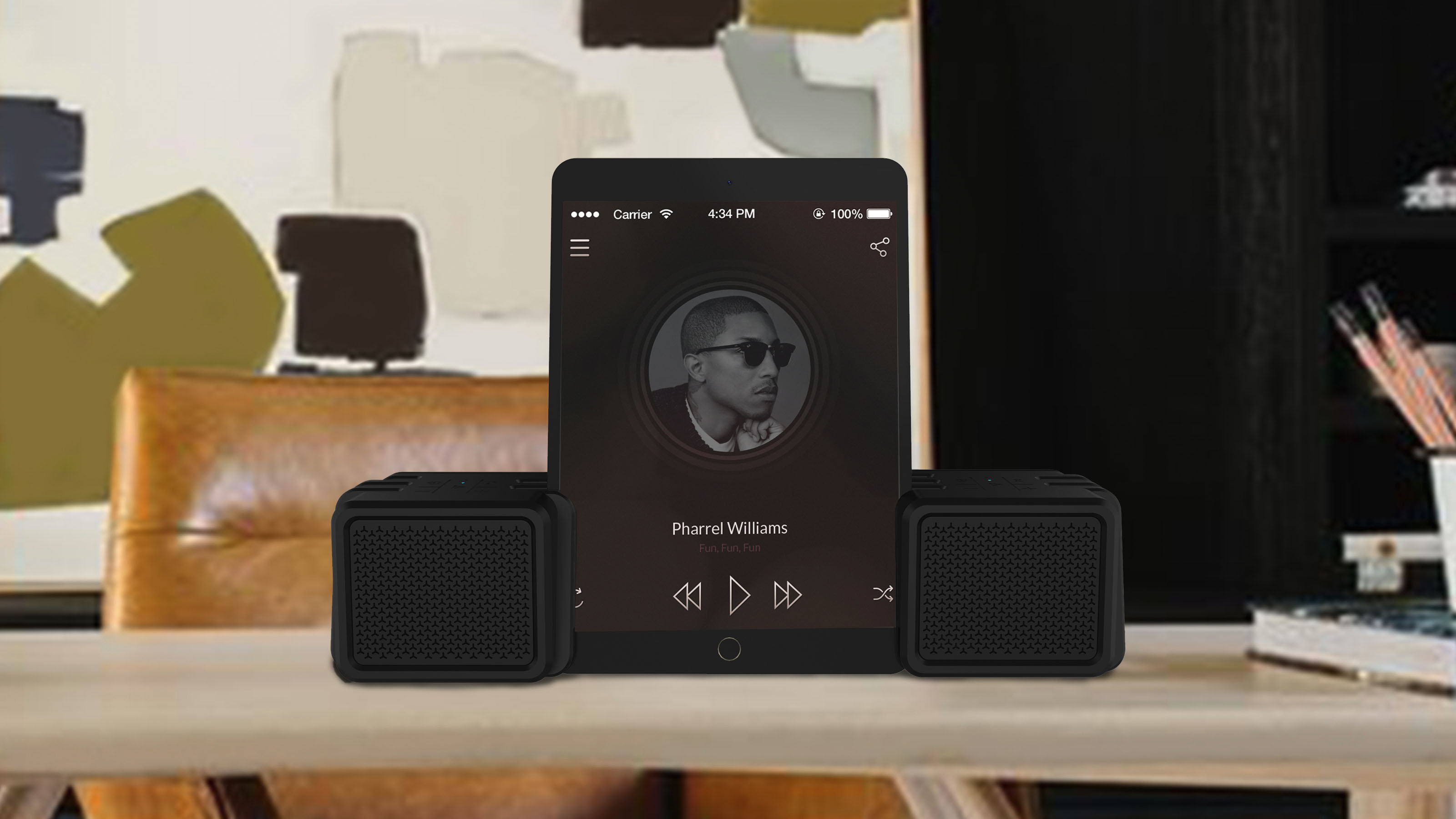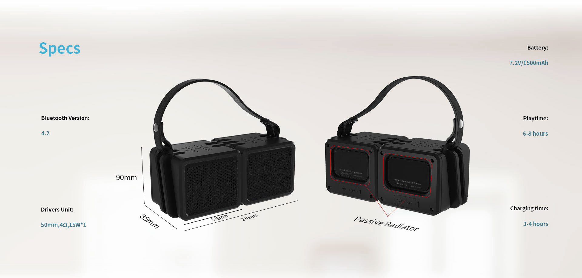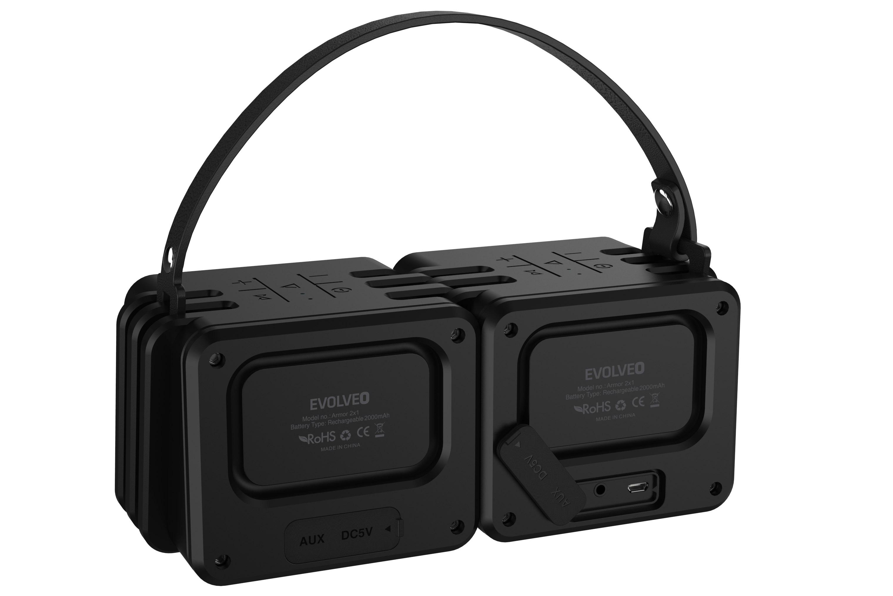 EVOLVEO Armor 2x1 je sestava dvou přenosných bezdrátových reproduktorů, který můžete složit do jednoho velkého reproduktoru a přepásat řemínkem, Pokud použijete reproduktory odděleně, můžete mezi ně vložit telefon, či tablet a sledovat váš oblíbený film na mobilním zařízení s kvalitním stereo zvukem.
