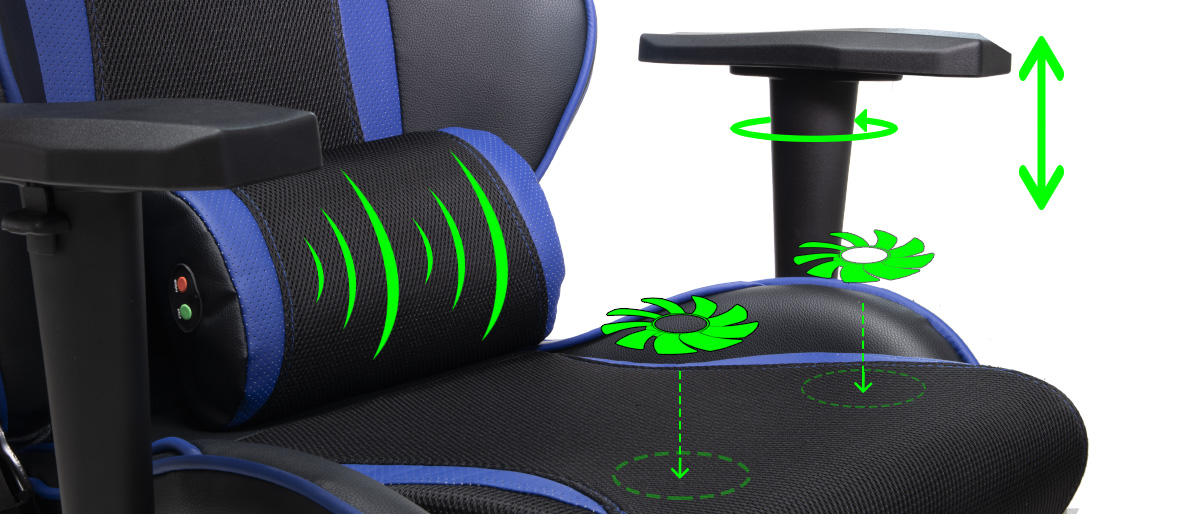 Ze spodní strany křesla jsou nainstalované dva 80mm ventilátory s 1800 RPM, které ochlazují sedací část židle a zajišťují tím komfortnější pocit při sezení. Napájení je zajištěno pomocí USB kabelu. Dále je ke křeslu dodávaná bederní opěrka, která pomáhá k lepšímu držení těla a dále disponuje masážními funkcemi. Je možné si vybrat mezi 8. různými masážními režimy. Opěrky rukou jsou pak 2D, to znamená, že je možná výšková nastavitelnost včetně nastavení do stran.