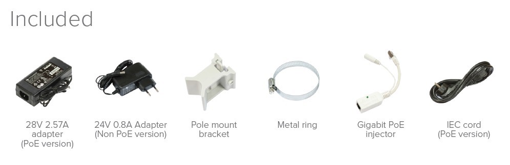 Součástí dodávky napájecí zdroj, PoE injektor a montážní příslušenství.